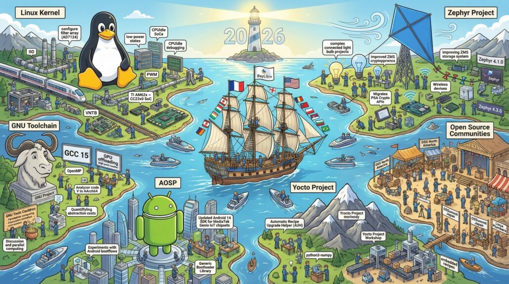Over the past year, BayLibre has acted as an active contributor and maintainer within projects including the Linux kernel, Zephyr RTOS, the Yocto Project, the GNU Toolchain, Mbed-TLS, U-Boot, AOSP and many others.